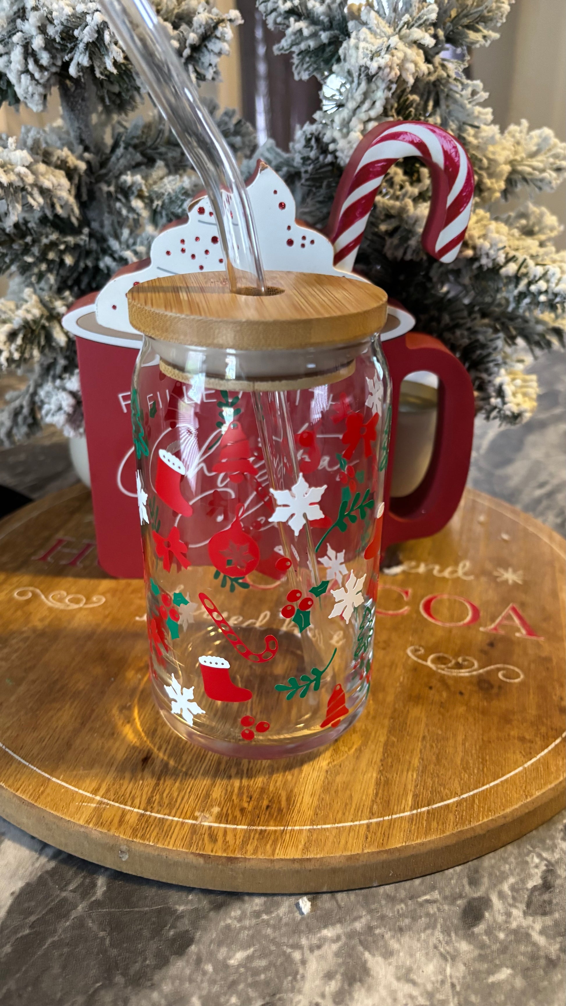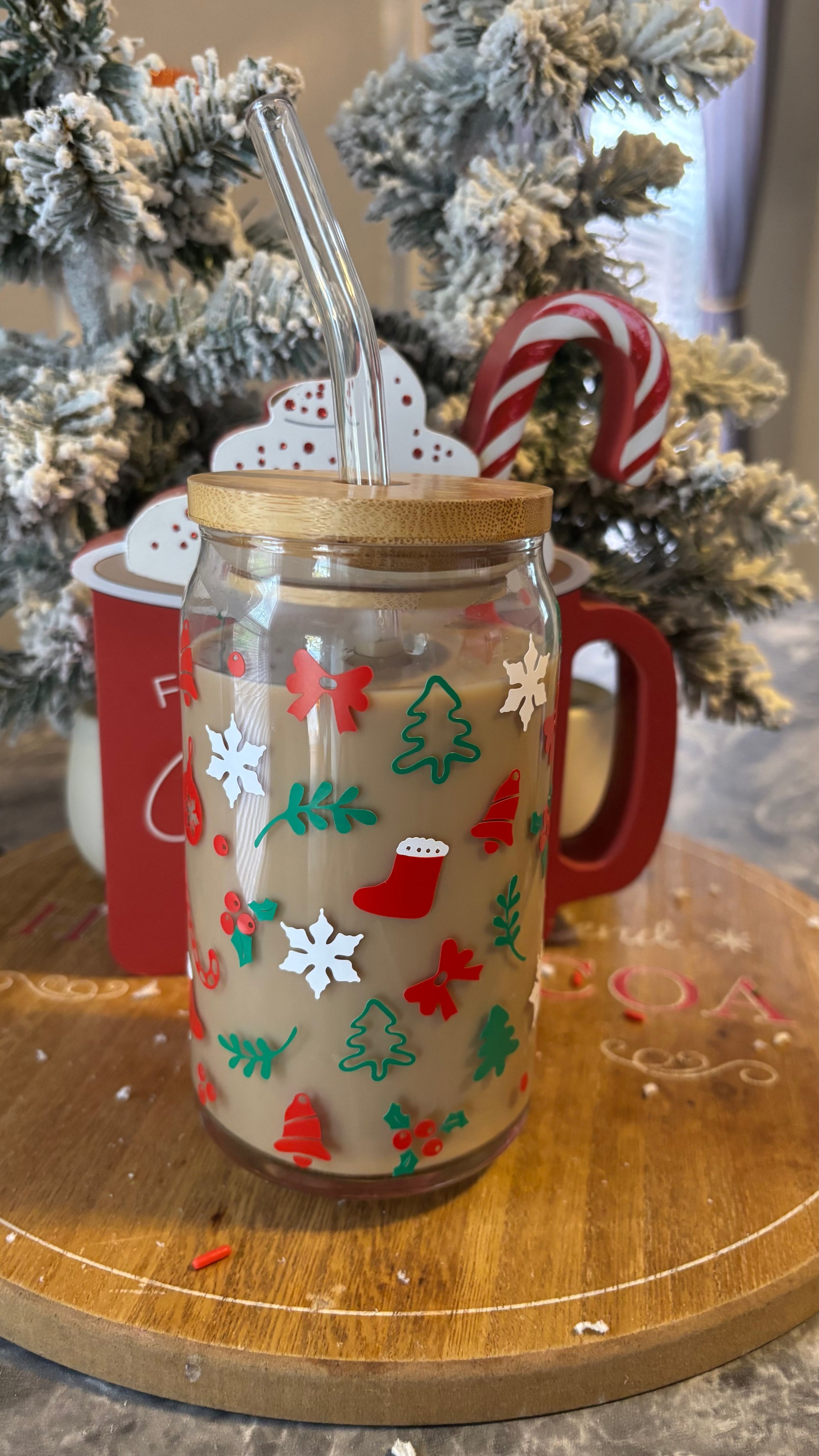 Experience the magic of the holiday season with our Christmas holiday glass cup. Perfect for hot cocoas, peppermint mochas, and all your holiday drinks. Featuring a 16oz libbey glass, bamboo lid, and clear glass straw, this cup is made with high quality vinyl for durability. Hand wash and handle with love, this cup is not microwave or dishwasher safe. Spread some holiday cheer with every sip.